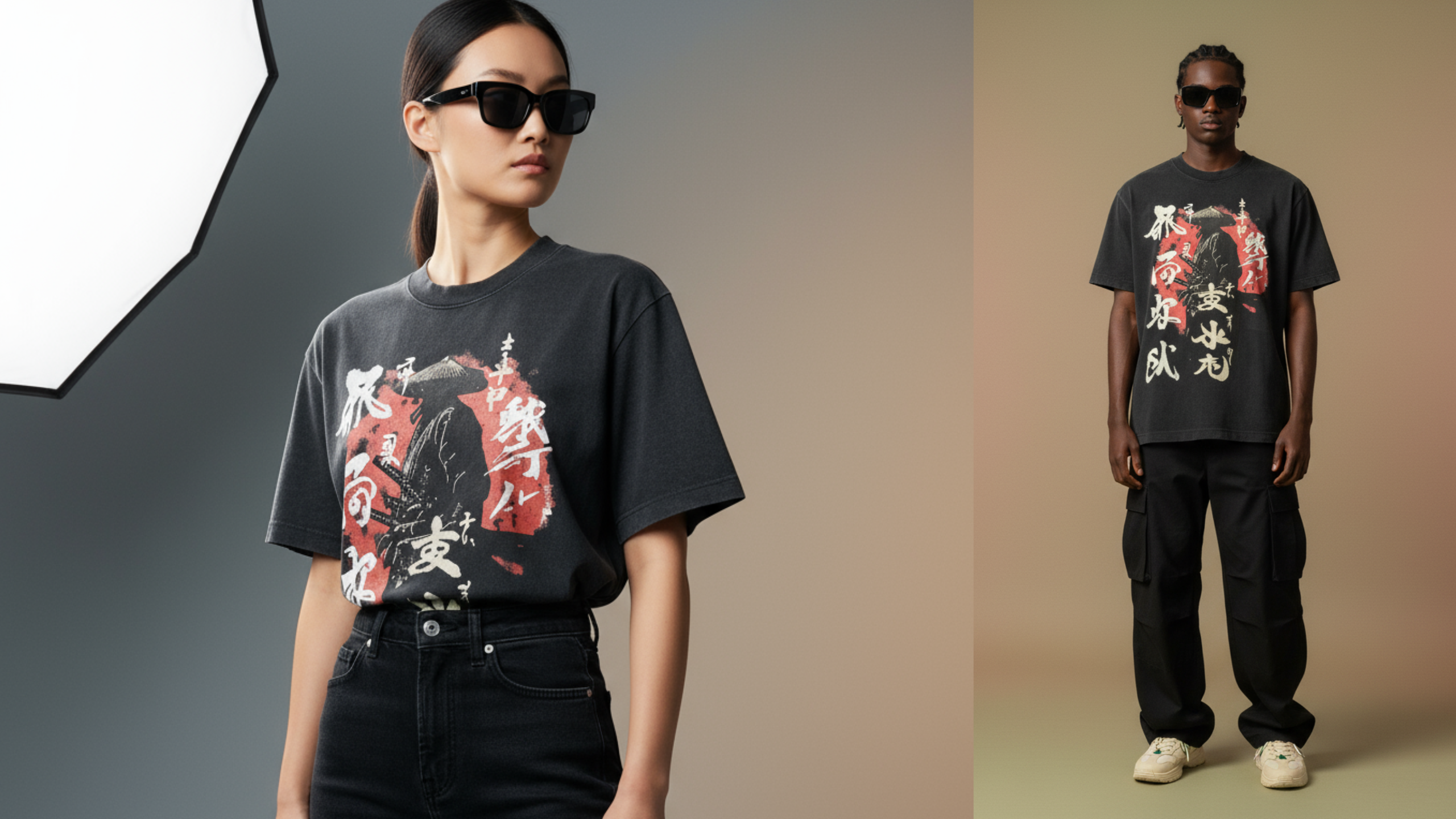 Vintage Snow Washed Oversized Cotton T-Shirt – Chinese Portrait Design