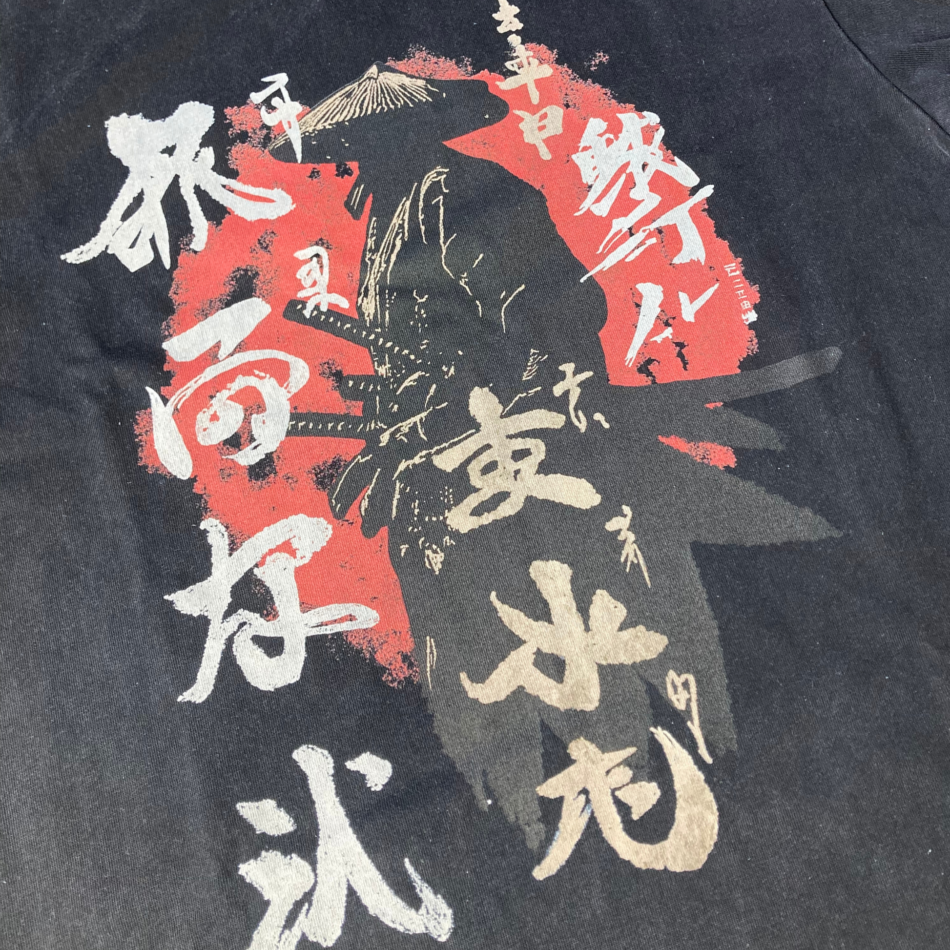 Elevate your streetwear style with this Japanese-inspired heavyweight vintage washed frayed t-shirt, featuring a bold and artistic design. The centerpiece artwork depicts a lone samurai in a straw hat wielding a sword, rendered in expressive dark ink strokes against a distressed red brushstroke background. Surrounded by Japanese kanji characters, the design channels strength, solitude, and timeless warrior spirit.
