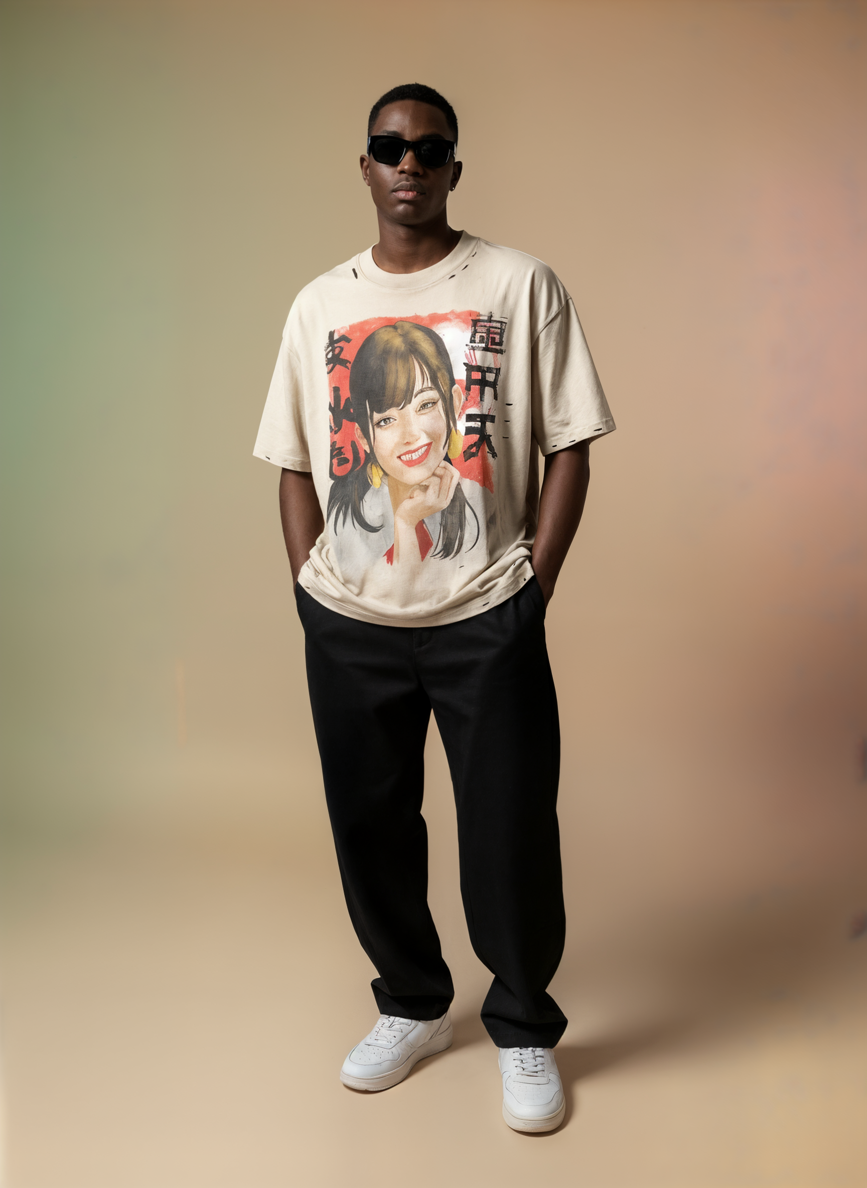 Vintage Frayed Boxy T-Shirt – Chinese Portrait Design